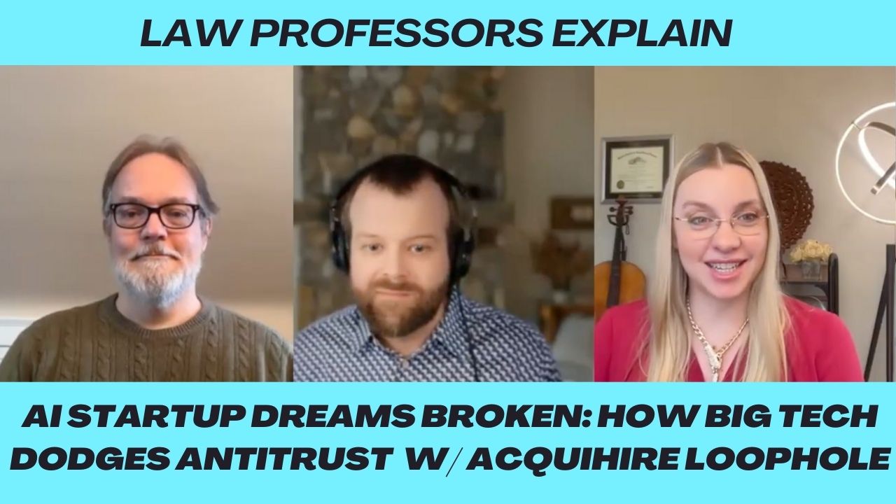 In this podcast-style discussion, Prof. Christa Laser (IP law), Prof. Chris Sagers (antitrust expert), and Chris Tosswill (startup founder) explore the controversial trend of "reverse acquihires" in the AI industry—where tech giants like Google, Microsoft, and Amazon absorb startup talent and IP without traditional acquisitions, often leaving the the startup in shambles. We examine the antitrust implications, the impact on startup employees, and whether this represents a fundamental breakdown of Silicon Valley's social contract.